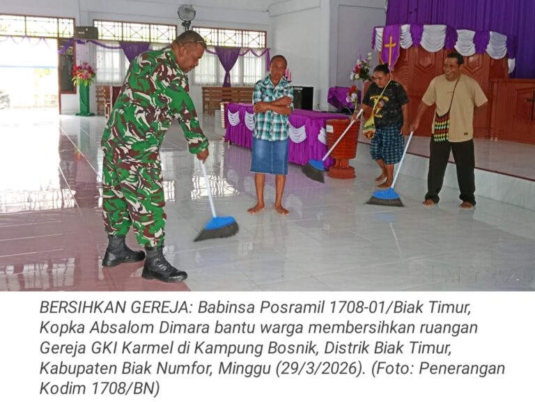 TOP-NEWS.id, BIAK TIMUR - Babinsa Posramil 1708-01/Biak Timur, Kopka Absalom Dimara turun langsung membantu warga membersihkan ruangan Gereja GKI Karmel...