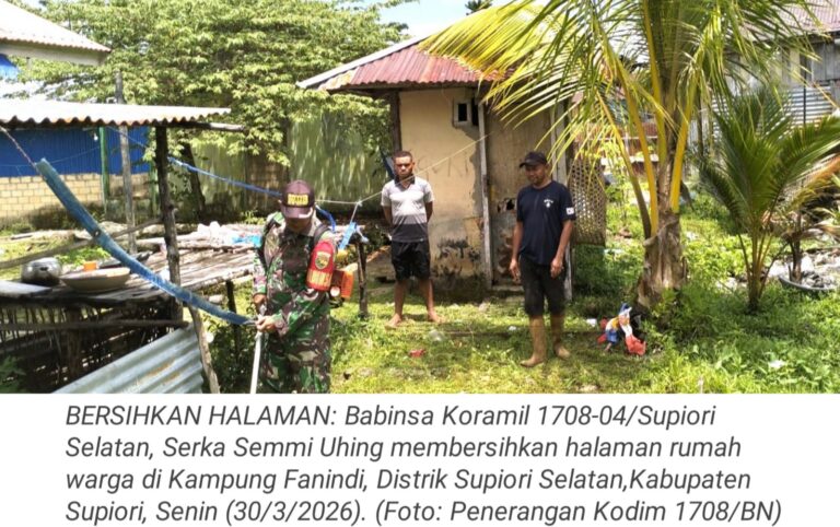TOP-NEWS.id, SUPIORI - Babinsa Koramil 1708-04/Supiori Selatan, Serka Semmi Uhing melaksanakan kegiatan membersihkan halaman rumah warga di Kampung Fanindi, Distrik...