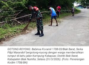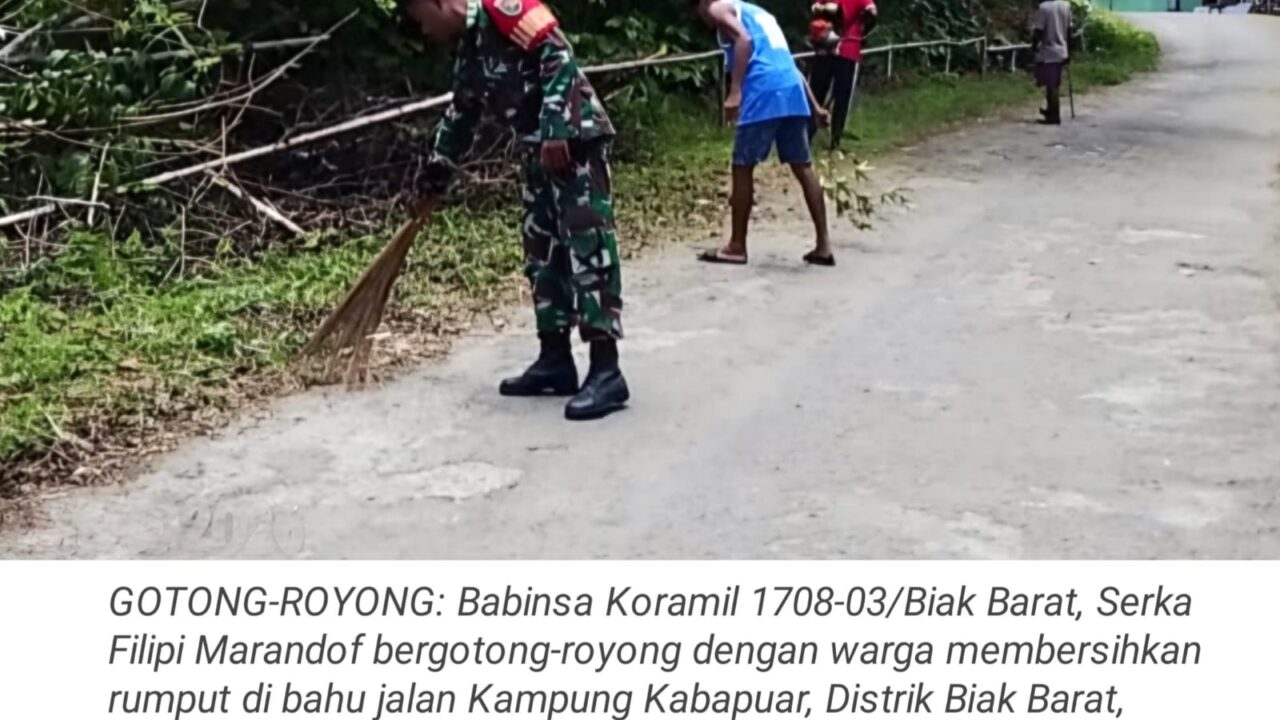 TOP-NEWS.id, BIAK BARAT - Babinsa Koramil 1708-03/Biak Barat, Serka Filipi Marandof bersama warga melaksanakan kegiatan gotong-royong membersihkan rumput di bahu...