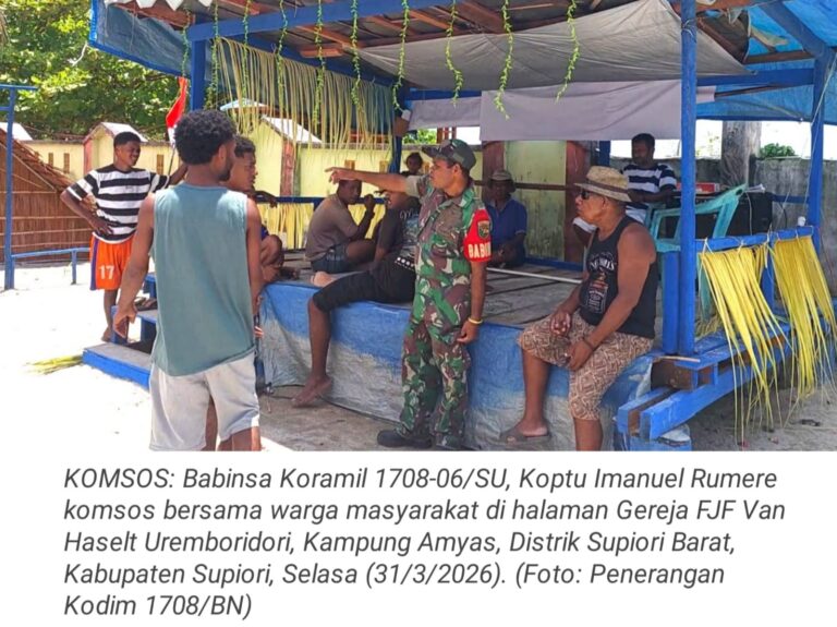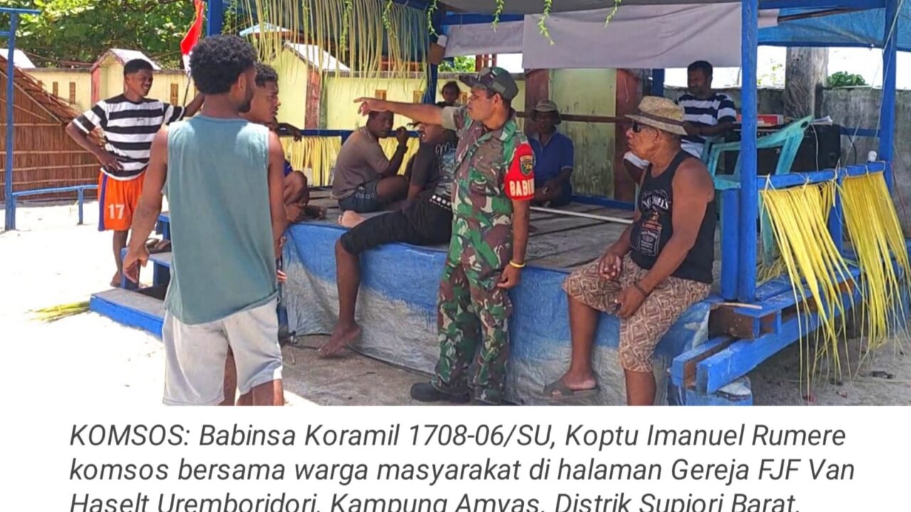 TOP-NEWS.id, SUPIORI - Babinsa Koramil 1708-06/SU, Koptu Imanuel Rumere melaksanakan komunikasi sosial (komsos) bersama warga masyarakat di halaman Gereja FJF...