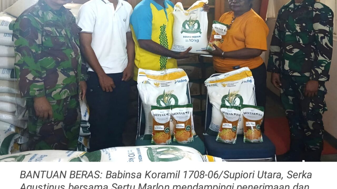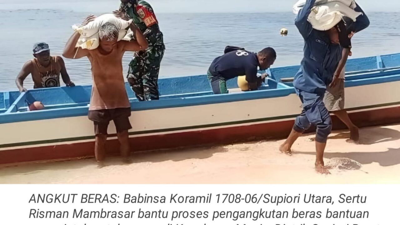 TOP-NEWS.id, SUPIORI - Babinsa Koramil 1708-06/Supiori Utara, Serka Agustinus bersama Sertu Marlon mendampingi penerimaan dan pembagian bantuan beras kepada masyarakat...