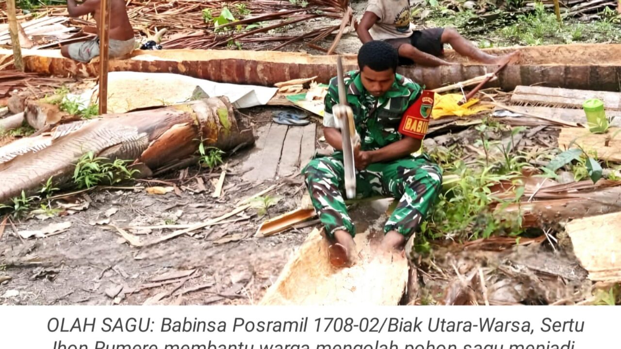 TOP-NEWS.id, WARSA - Babinsa Posramil 1708-02/Biak Utara-Warsa, Sertu Jhon Rumere membantu warga mengolah pohon sagu menjadi bahan makanan di Kampung...