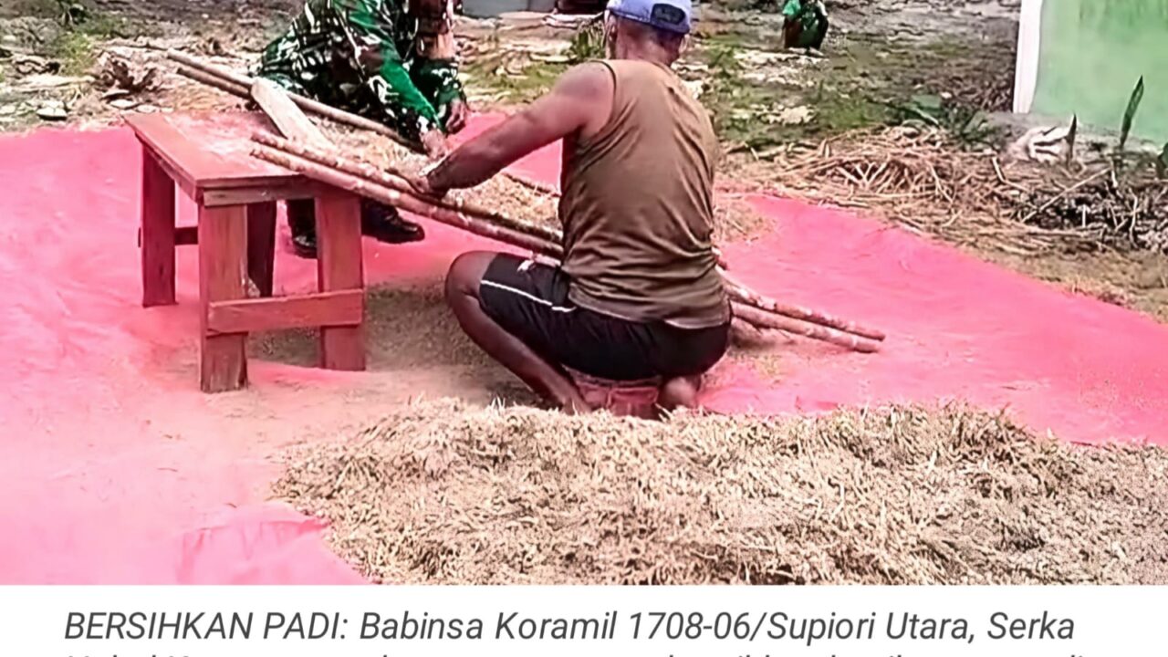 TOP-NEWS.id, SUPIORI - Babinsa Koramil 1708-06/Supiori Utara, Serka Habel Kopong turun langsung membantu warga membersihkan hasil panen padi dari jerami...