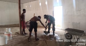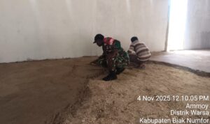 TOP-NEWS.id, WARSA – Babinsa Posramil 1708-02/BU-Warsa, Serka Paulus Karuapi menunjukkan kepeduliannya terhadap warga binaan dengan membantu proses pengecoran lantai kios milik warga di Kampung Amoi, Distrik Warsa, Kabupaten Biak Numfor, Papua, Selasa (4/11/2025).