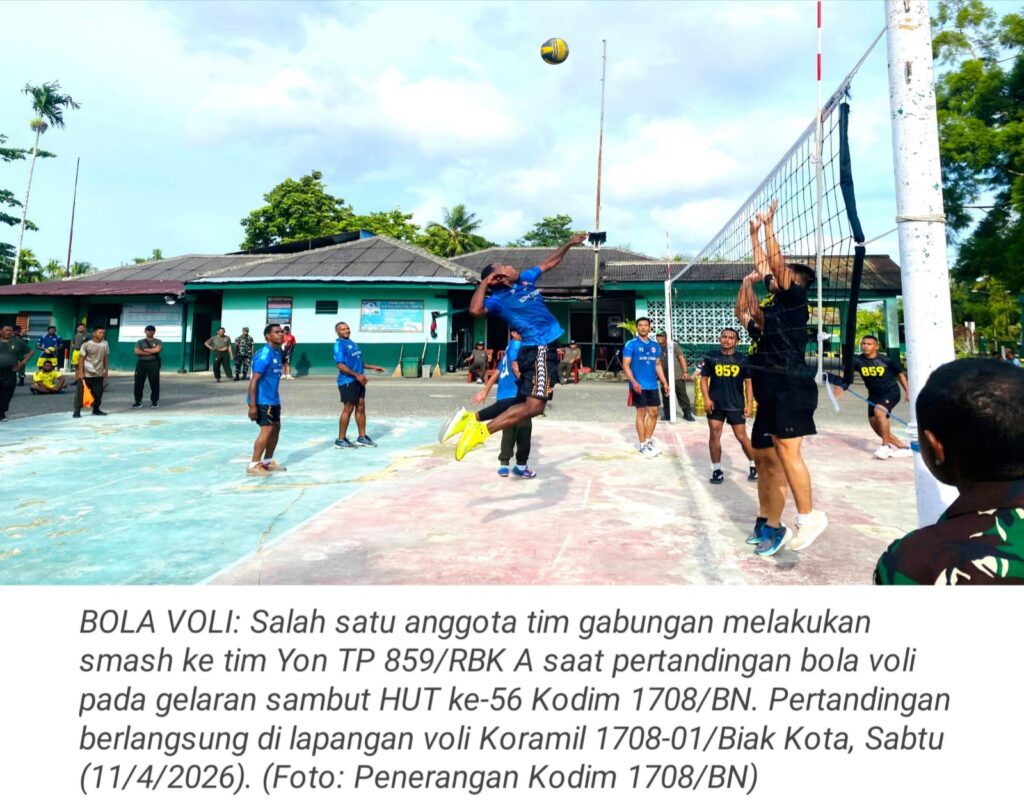 TOP-NEWS.id, BIAK – Dalam rangka menyambut dan memeriahkan HUT ke-56 Kodim 1708/BN, Kodim 1708/BN menggelar pertandingan bola voli yang berlangsung di lapangan voli Koramil 1708-01/Biak Kota, Jalan Sriwijaya, Distrik Samofa, Kabupaten Biak Numfor, Papua, Sabtu (11/4/2026).