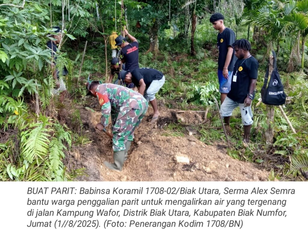 TOP-NEWS.id, BIAK UTARA – Sebagai bentuk nyata kepedulian TNI terhadap masyarakat, Babinsa Koramil 1708-02/Biak Utara, Serma Alex Semra bersama Serda Alfret Foom membantu warga buat parit di Kampung Wafor, Distrik Biak Utara, Kabupaten Biak Numfor, Papua, Jumat (1/8/2025).