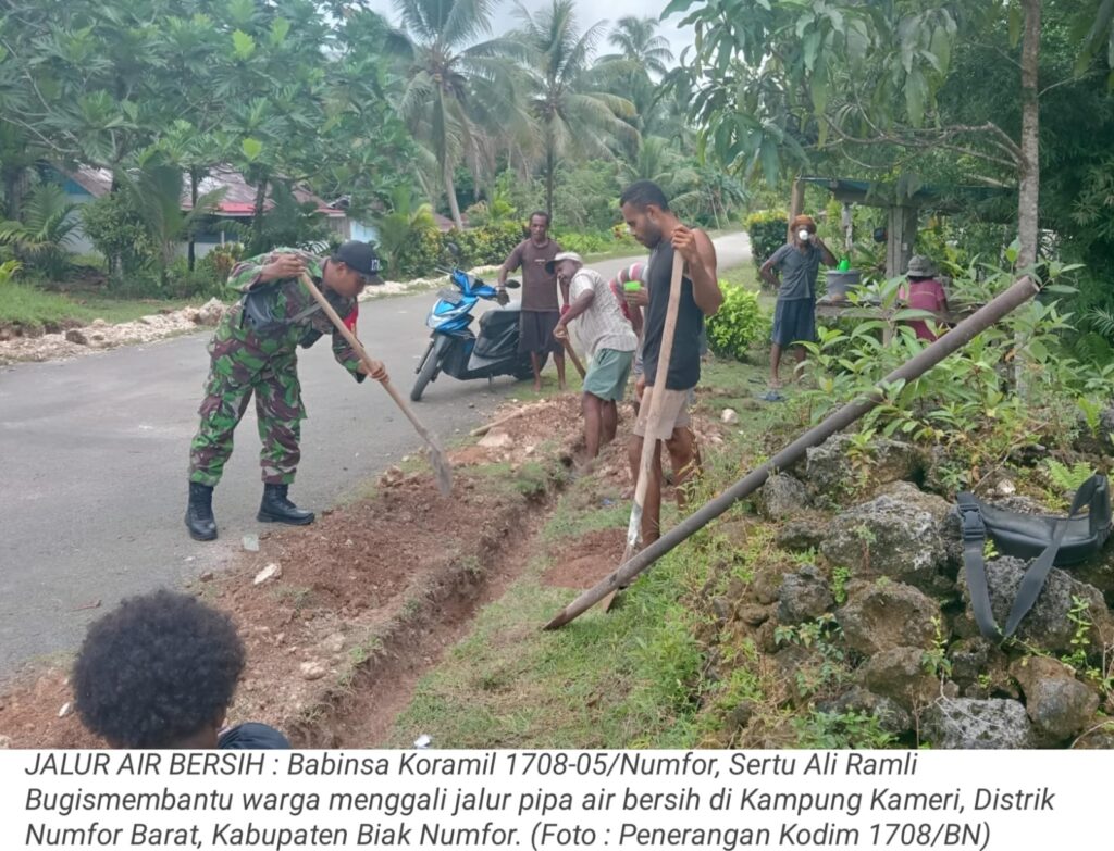 TOP-NEWS.id, NUMFOR – Bentuk kepedulian terhadap kebutuhan dasar masyarakat kembali ditunjukkan Babinsa Koramil 1708-05/Numfor, Sertu Ali Ramli Bugis, yang turut membantu warga menggali jalur pipa air bersih di Kampung Kameri, Distrik Numfor Barat, Kabupaten Biak Numfor, Senin (17/11/2025).