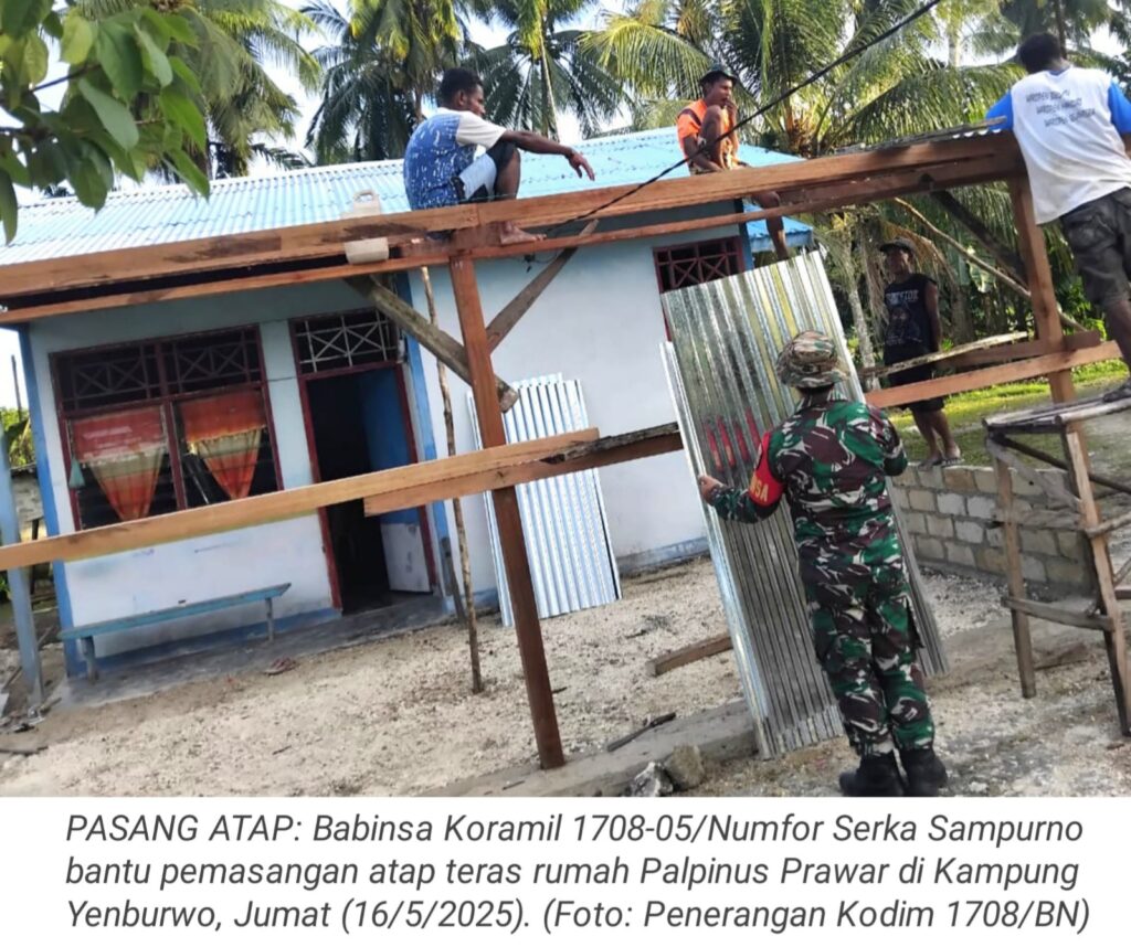 TOP-NEWS.id, NUMFOR – Upaya memperkuat hubungan antara TNI dan masyarakat, Babinsa Koramil 1708-05/Numfor Serka Sampurno bantu pemasangan atap teras rumah milik salah satu warga binaannya, Palpinus Prawar di Kampung Yenburwo, Distrik Numfor Timur, Kabupaten Biak Numfor, Papua, Jumat (16/5/2025).