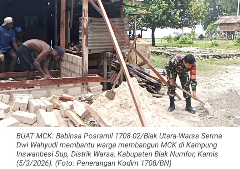 TOP-NEWS.id, WARSA - Babinsa Posramil 1708-02/Biak Utara-Warsa Serma Dwi Wahyudi membantu warga membangun MCK (mandi, cuci, kakus) di Kampung Inswanbesi...