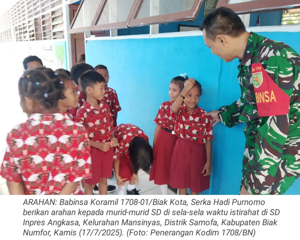 TOP-NEWS.id, BIAK – Babinsa Koramil 1708-01/Biak Kota, Serka Hadi Purnomo memberikan arahan kepada para murid di sela-sela waktu istirahat, Kehadiran Babinsa di tengah-tengah anak sekolah disambut hangat dan penuh antusias oleh para murid SD Inpres Angkasa, Kelurahan Mansinyas, Distrik Samofa, Kabupaten Biak Numfor, Papua, Kamis (17/7/2025).