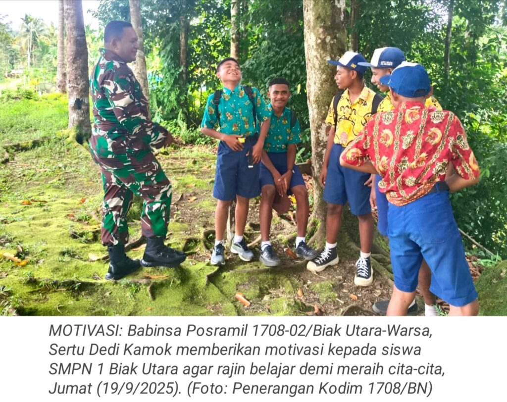 TOP-NEWS.id, BIAK UTARA – Babinsa Posramil 1708-02/Biak Utara-Warsa, Sertu Dedi Kamok memberikan motivasi dan semangat belajar kepada siswa SMPN 1 Biak Utara saat ditemui di Kampung Rosayendi, Distrik Biak Utara, Kabupaten Biak Numfor, Papua, Jumat (19/9/2025).