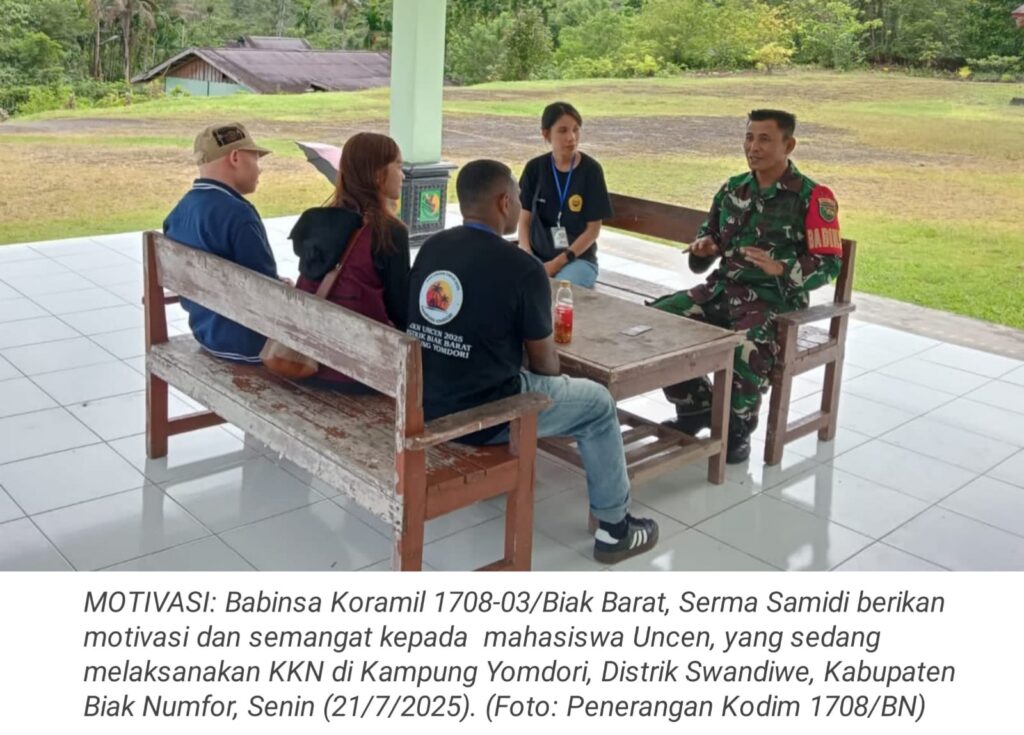 TOP-NEWS.id, BIAK BARAT – Dalam rangka mendukung kegiatan mahasiswa sekaligus mempererat hubungan antara TNI dan kalangan akademisi, Babinsa Koramil 1708-03/Biak Barat, Serma Samidi memberikan motivasi dan semangat kepada mahasiswa Universitas Cenderawasih (Uncen) yang sedang melaksanakan Kuliah Kerja Nyata (KKN) di Kampung Yomdori, Distrik Swandiwe, kabupaten Biak Numfor, Papua, Senin (21/7/2025).