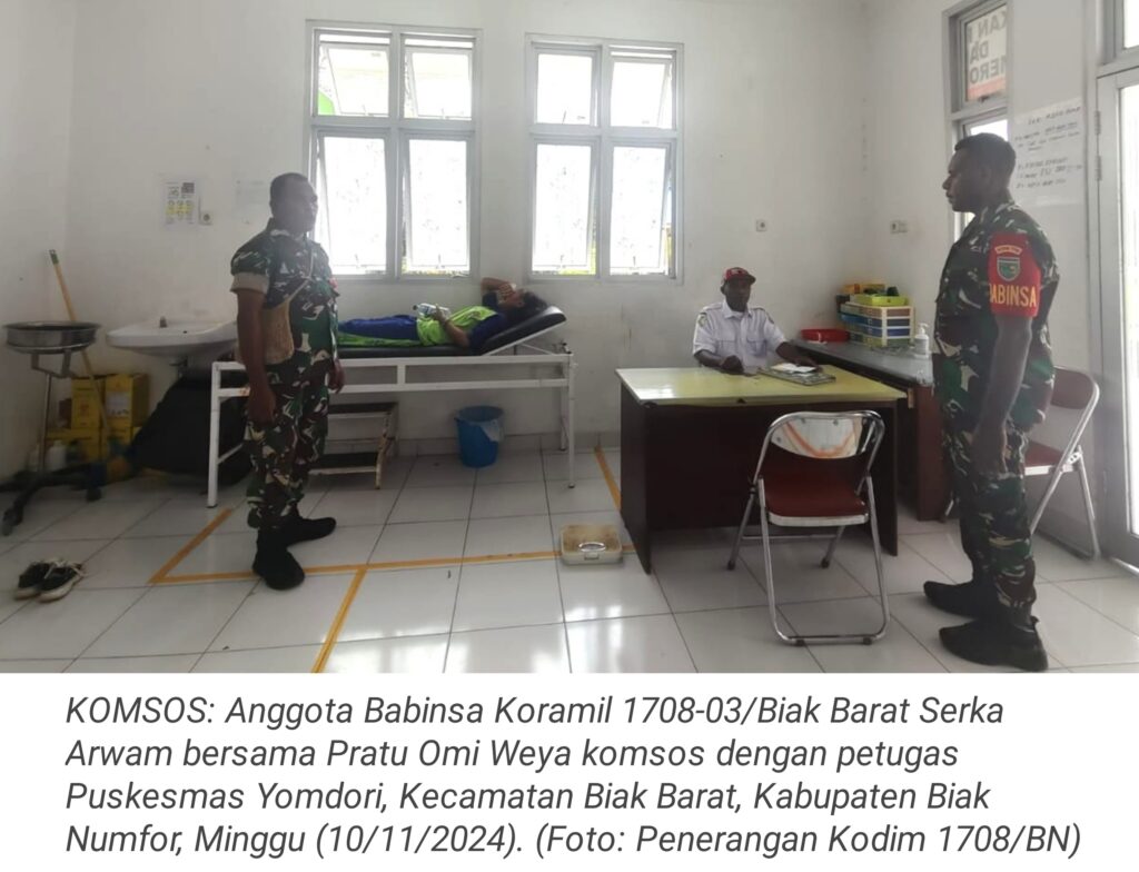 TOP-NEWS.id, BIAK BARAT – Dalam rangka mendukung tugas pokok dan terwujudnya kemanunggalan TNI dengan rakyat, Bintara Pembina Desa (Babinsa) Koramil 1708-03/Biak Barat Serka Arwam bersama Pratu Omi Weya melaksanakan komunikasi sosial (komsos) dengan petugas Puskesmas Yomdori, Kecamatan Biak Barat, Kabupaten Biak Numfor, Provinsi Papua, Minggu (10/11/2024).