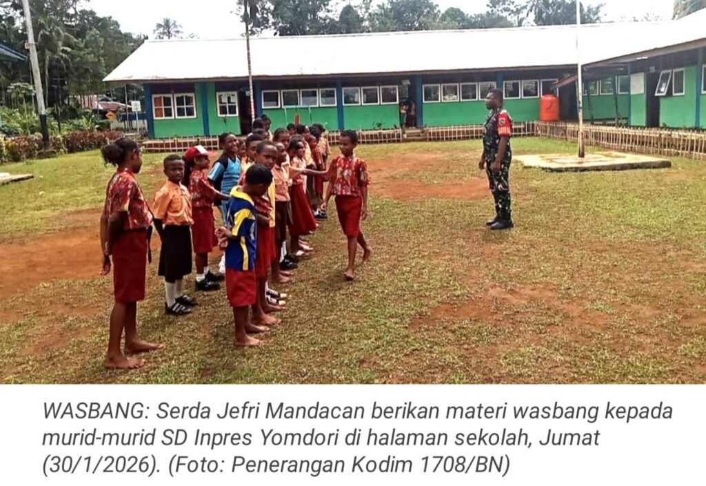 TOP-NEWS.id, YOMDORIBabinsa Koramil 1708-03/Biak Barat Serda Jefri Mandacan melaksanakan kegiatan pembinaan teritorial memberikan materi wawasan kebangsaan (wasbang) kepada murid-murid SD Inpres Yomdori, Distrik Biak Barat, Kabupaten Biak Numfor, Papua, Jumat (30/1/2026).