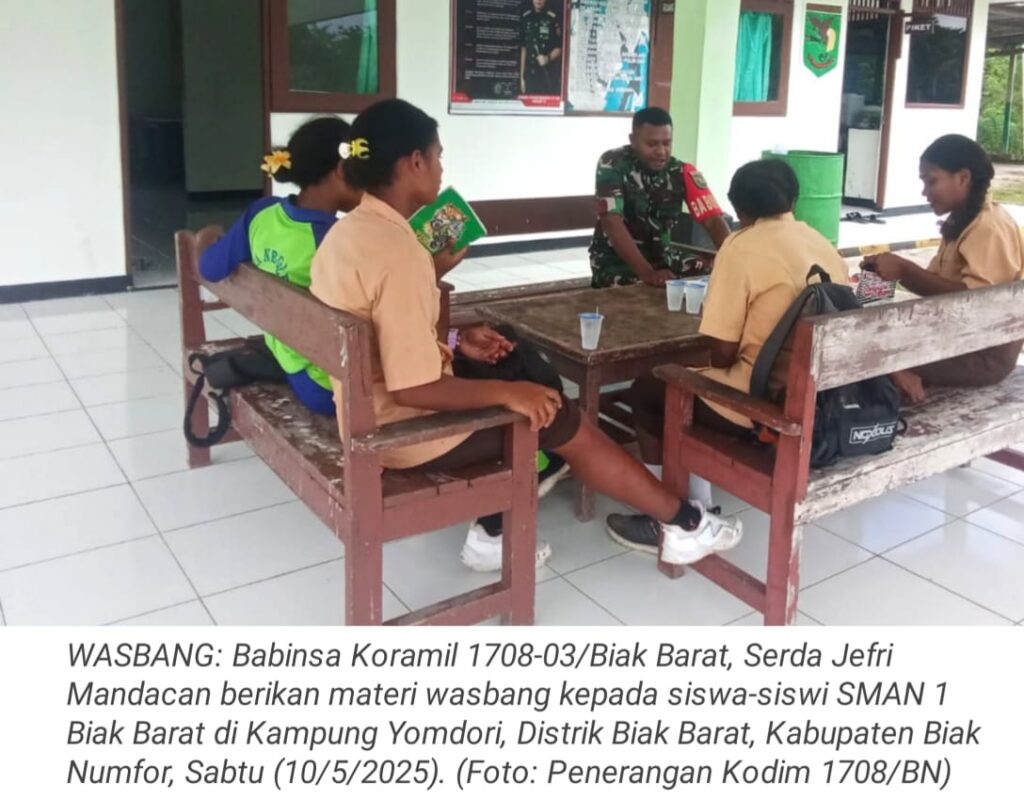 TOP-NEWS.id, BIAK BARAT – Dalam rangka memperkuat rasa cinta Tanah Air dan membangun karakter generasi muda, Babinsa Koramil 1708-03/Biak Barat, Serda Jefri Mandacan memberikan materi wawasan kebangsaan (wasbang) kepada pelajar SMAN 1 Biak Barat di Kampung Yomdori, Distrik Biak Barat, Kabupaten Biak Numfor, Papua, Sabtu (10/5/2025).