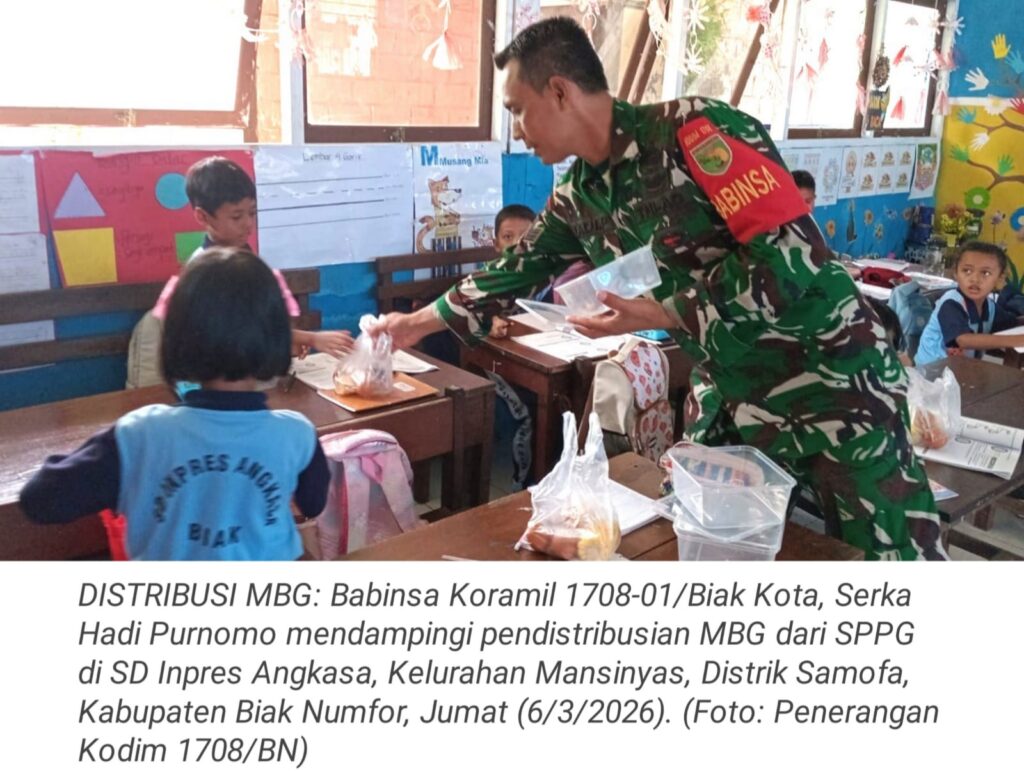 TOP-NEWS.id, BIAKBabinsa Koramil 1708-01/Biak Kota, Serka Hadi Purnomo melaksanakan pendampingan kegiatan pendistribusian makan bergizi gratis (MBG), yang diselenggarakan oleh Satuan Pelayanan Pemenuhan Gizi (SPPG) di SD Inpres Angkasa, Kelurahan Mansinyas, Distrik Samofa, Kabupaten Biak Numfor, Papua, Jumat (6/3/2026).