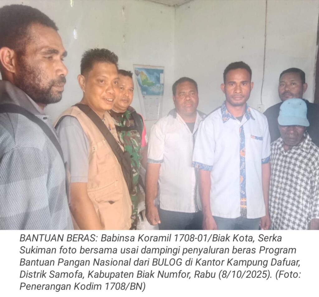 TOP-NEWS.id, BIAKBabinsa Koramil 1708-01/Biak Kota, Serka Sukiman melaksanakan pendampingan kegiatan penyaluran beras Program Bantuan Pangan Nasional dari BULOG di Kantor Kampung Dafuar, Distrik Samofa, Kabupaten Biak Numfor, Papua, Rabu (8/10/2025).