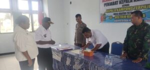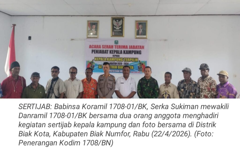 TOP-NEWS.id, BIAK – Babinsa Koramil 1708-01/BK, Serka Sukiman mewakili Danramil 1708-01/BK bersama dua orang anggota menghadiri kegiatan serah terima jabatan (setijab) kepala kampung di Distrik Biak Kota, Kabupaten Biak Numfor, Papua, Rabu (22/4/2026).
