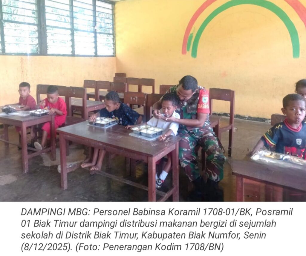 TOP-NEWS.id, BIAK TIMUR – Dalam rangka mendukung program pemerintah terkait Makan Bergizi Gratis (MBG) untuk anak usia sekolah, Babinsa Koramil 1708-01/BK, Posramil 01 Biak Timur yang dipimpin Serka F. Sombuk bersama Sertu Nahor Awete, Sertu Petrus Mandosir, Sertu Wahyu Hendro Patrias Setiawan, Kopka Absalom Dimara, dan Kopka Yosep Silaka mendampingi distribusi makanan bergizi di sejumlah sekolah di Distrik Biak Timur, Kabupaten Biak Numfor, Senin, (8/12/2025).