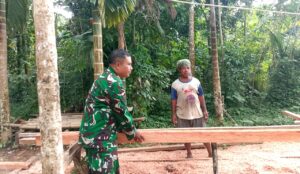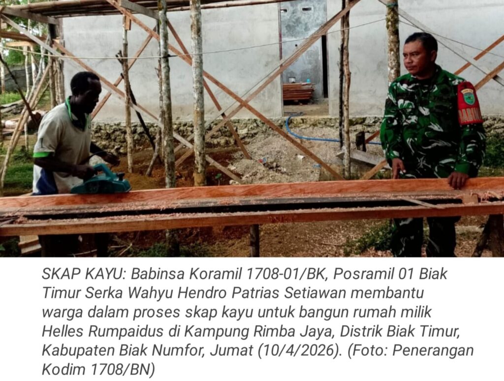 TOP-NEWS.id, BIAK TIMUR – Babinsa Koramil 1708-01/BK, Posramil 01 Biak Timur Serka Wahyu Hendro Patrias Setiawan turun langsung membantu warga dalam proses skap kayu untuk pembangunan rumah milik Helles Rumpaidus di Kampung Rimba Jaya, Distrik Biak Timur, Kabupaten Biak Numfor, Papua Jumat (10/4/2026).