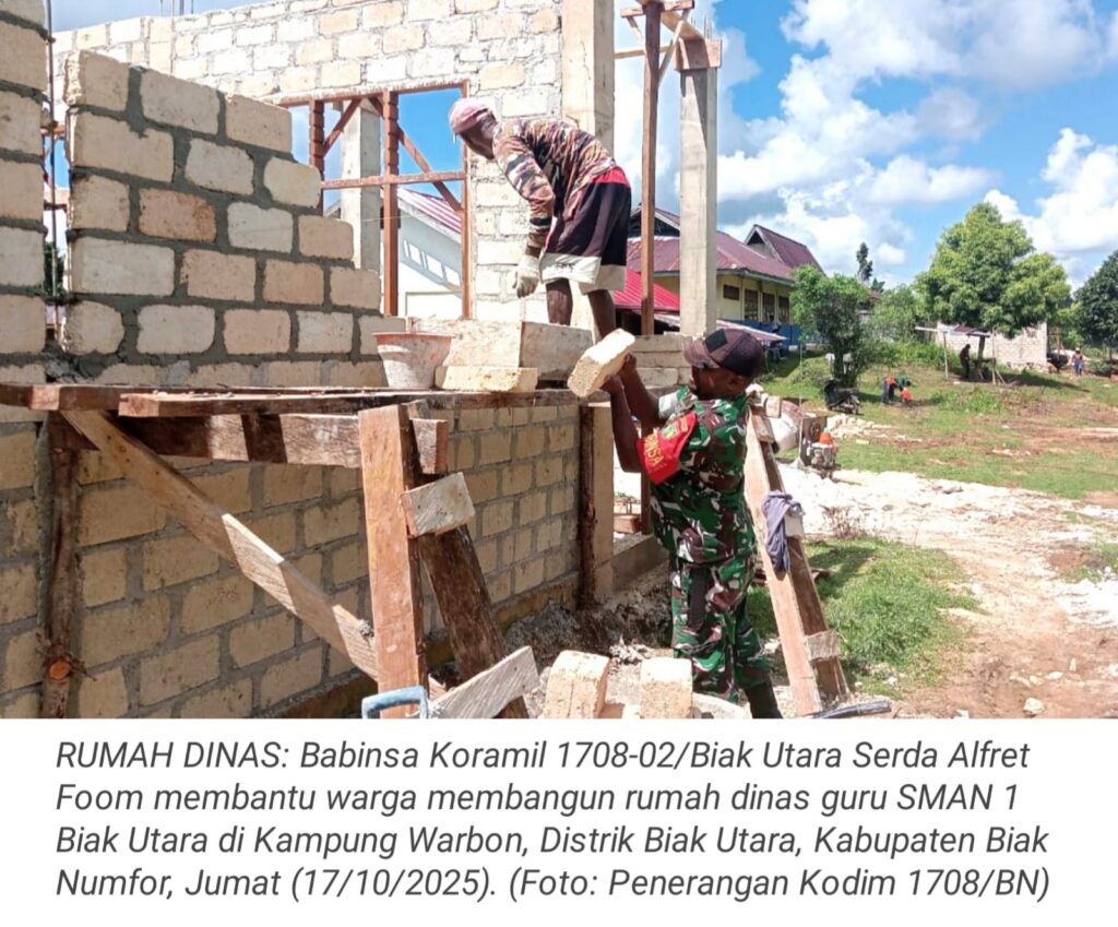 TOP-NEWS.id, BIAK UTARA – Babinsa Koramil 1708-02/Biak Utara Serda Alfret Foom ikut membantu warga dalam pembangunan rumah dinas guru SMA Negeri (SMAN) 1 Biak Utara di Kampung Warbon, Distrik Biak Utara, Kabupaten Biak Numfor, Papua, Jumat (17/10/2025).