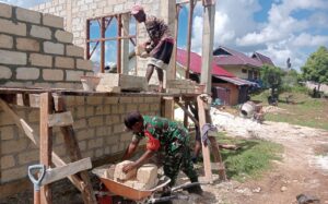 Dalam pelaksanaannya, Babinsa terlihat ikut bekerja bersama masyarakat, mulai dari mengangkut material bangunan, mencampur semen, hingga membantu proses pemasangan dinding.