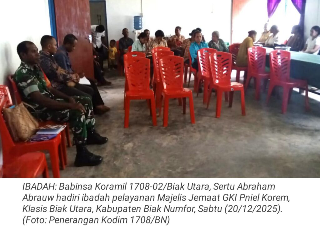 TOP-NEWS.id, BIAK UTARA – Upaya menciptakan rasa aman dan nyaman bagi masyarakat saat menjalankan ibadah, Babinsa Koramil 1708-02/Biak Utara, Sertu Abraham Abrauw hadir dalam ibadah pelayanan Majelis Jemaat GKI Pniel Korem, Klasis Biak Utara, Kabupaten Biak Numfor, Papua, Sabtu (20/12/205).