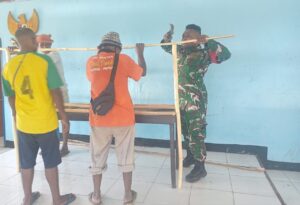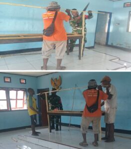 Jelang pilkades, Serda Alfret Foom dan warga persiapkan tempat pencoblosan pilkades. (Foto: Penerangan Kodim 1708/BN)