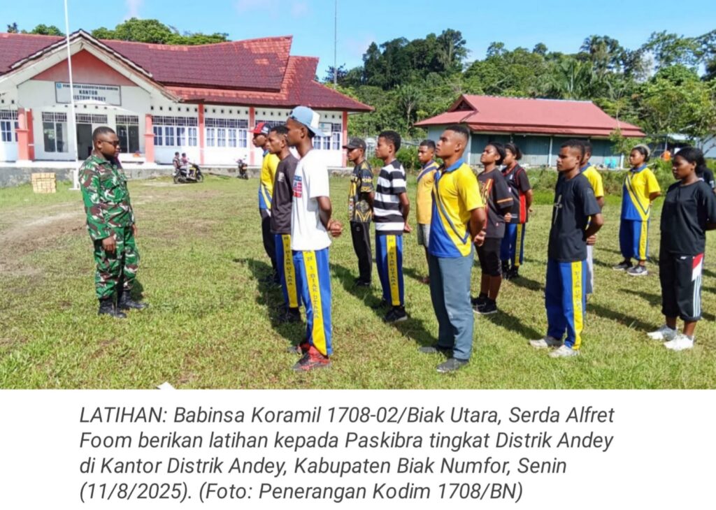 TOP-NEWS.id, BIAK UTARA – Sambut Hari Ulang Tahun ke-80 Kemerdekaan Republik Indonesia (RI), Babinsa Koramil 1708-02/Biak Utara, Serda Alfret Foom memberikan pelatihan kepada Pasukan Pengibar Bendera (Paskibra) tingkat Distrik AndeyB di Kantor Distrik Andey, Kabupaten Biak Numfor, Papua, Senin (11/8/2025).