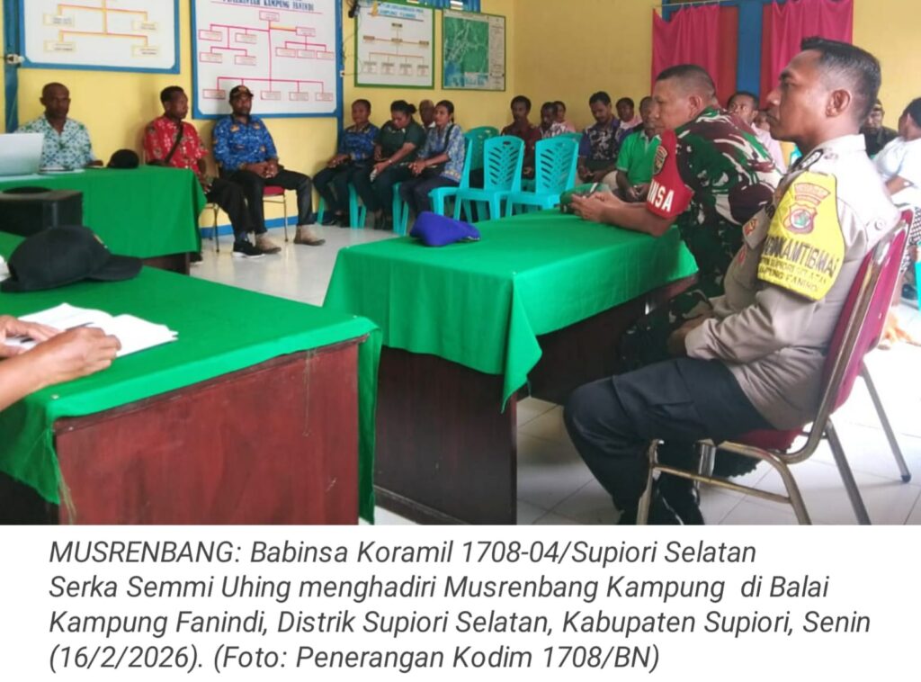 TOP-NEWS.id, SUPIORI SELATAN – Babinsa Koramil 1708-04/Supiori Selatan Serka Semmi Uhing menghadiri kegiatan Musyawarah Perencanaan Pembangunan (Musrenbang) Kampung yang dilaksanakan di Balai Kampung Fanindi, Distrik Supiori Selatan, Kabupaten Supiori, Papua, Senin (16/2/2026).