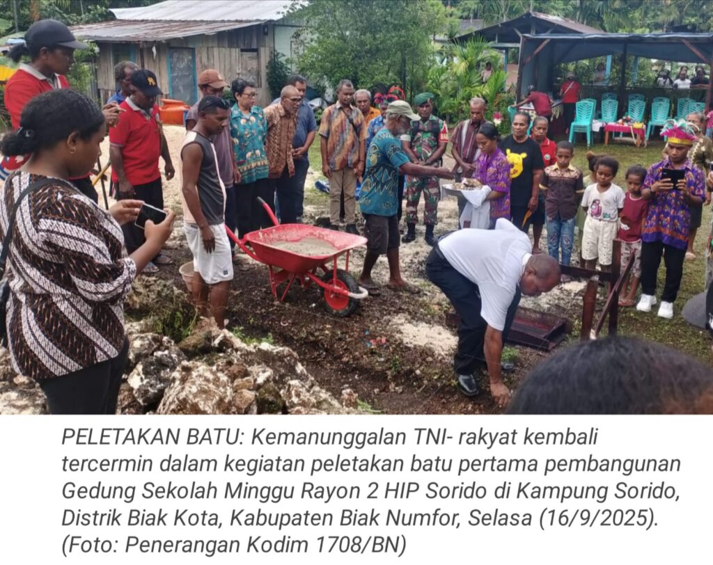 TOP-NEWS.id, BIAK NUMFOR – Wujud nyata kemanunggalan TNI dan rakyat kembali tercermin dalam kegiatan peletakan batu pertama pembangunan Gedung Sekolah Minggu Rayon 2 HIP Sorido di Kampung Sorido, Distrik Biak Kota, Kabupaten Biak Numfor, Papua, Selasa (16/9/2025).
