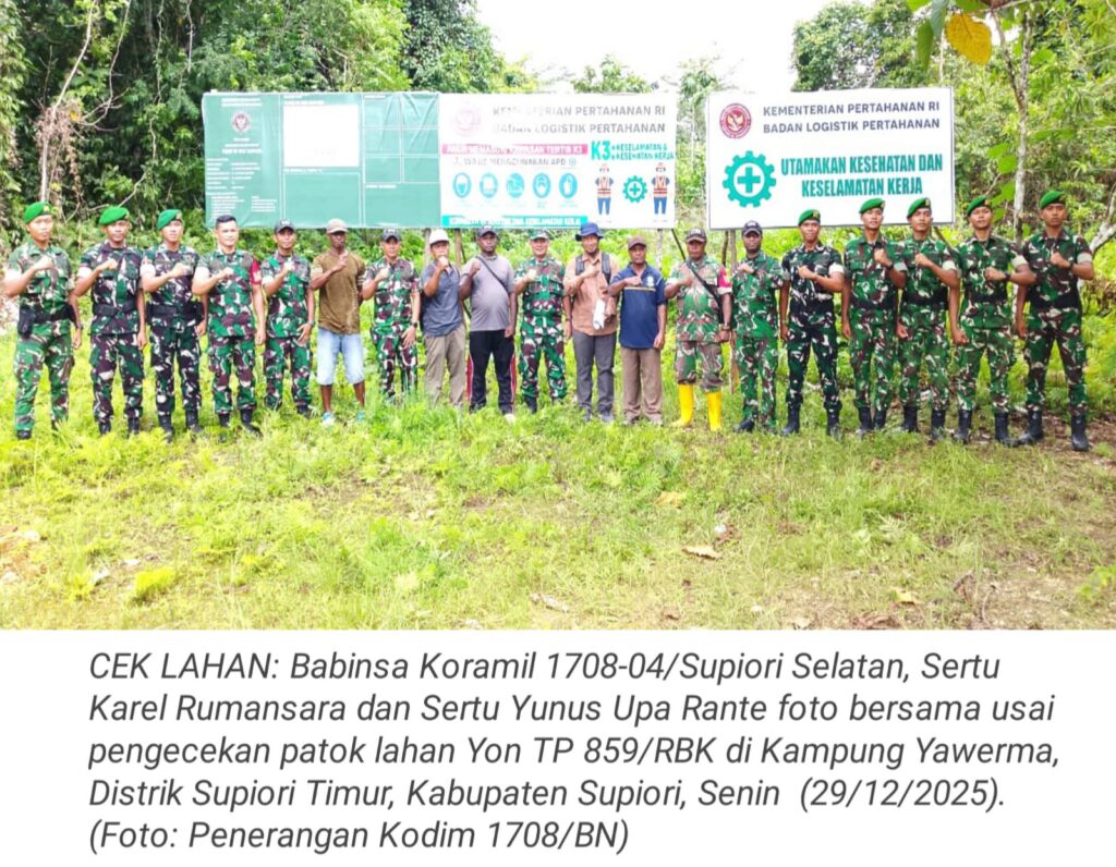 TOP-NEWS.id, SUPIORIBabinsa Koramil 1708-04/Supiori Selatan, Sertu Karel Rumansara dan Sertu Yunus Upa Rante menghadiri kegiatan pengecekan patok lahan Yon TP 859/RBK yang berlokasi di Kampung Yawerma, Distrik Supiori Timur, Kabupaten Supiori, Papua, Senin (29/12/2025).