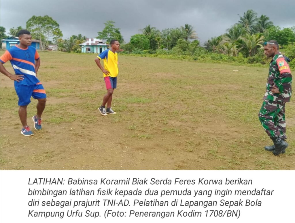 TOP-NEWS.id, BIAK – Babinsa Koramil 1708-01/Biak Kota Serda Feres Korwa memberikan pelatihan fisik atau tes awal kebugaran jasmani bagi pemuda yang berkeinginan mendaftar sebagai calon prajurit TNI-AD di Lapangan Sepak Bola Kampung Urfu Sup, Distrik Yendidori, Kabupaten Biak Numfor, Papua, Jumat (14/7/2023).