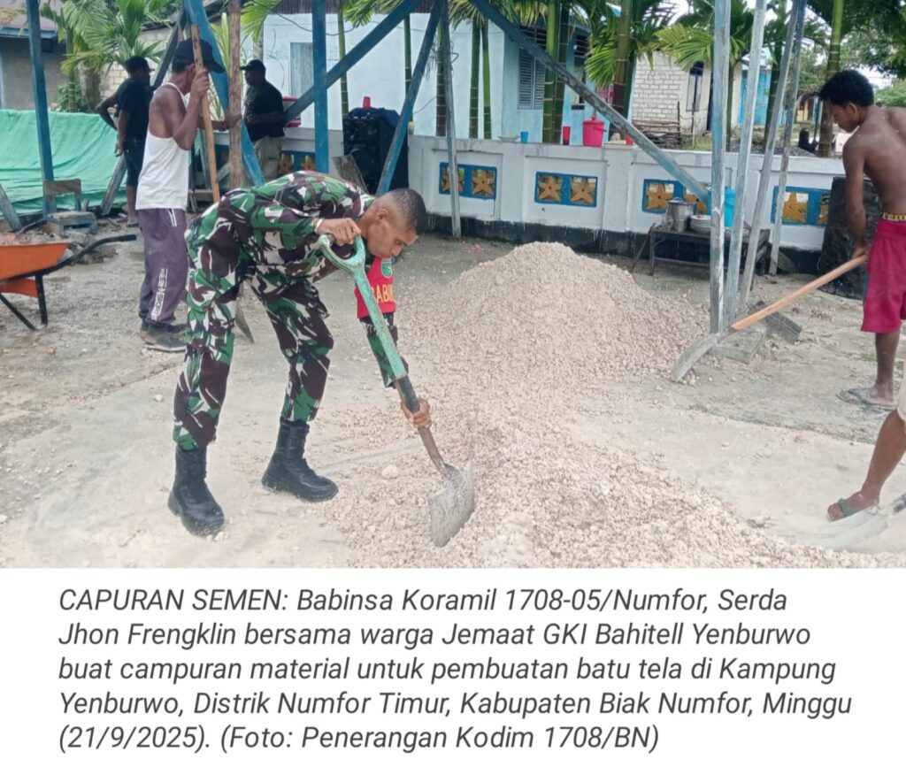 TOP-NEWS.id, KEPULAUAN NUMFOR – Babinsa Koramil 1708-05/Numfor, Serda Jhon Frengklin bersama warga Jemaat GKI Bahitell Yenburwo membantu pembuatan campuran material yang akan digunakan untuk pembuatan batu tela. Kegiatan tersebut, berlangsung di Kampung Yenburwo, Distrik Numfor Timur, Kabupaten Biak Numfor, Papua, Minggu (21/9/2025).