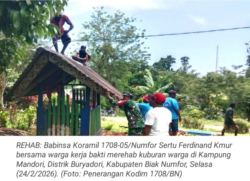 TOP-NEWS.id, MANDORI – Dalam rangka pembinaan teritorial serta menumbuhkan budaya gotong-royong di tengah masyarakat, Babinsa Koramil 1708-05/Numfor Sertu Ferdinand Kmur bersama warga melaksanakan kerja bakti merehabilitasi kuburan warga di Kampung Mandori, Distrik Buryadori, Kabupaten Biak Numfor, Papua, Selasa (24/2/2026).