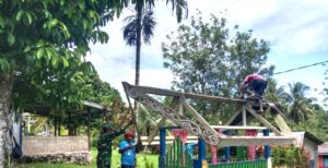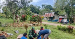 Pada kegiatan tersebut, Babinsa bersama masyarakat tampak kompak saling bahu membahu melakukan perehaban kuburan dengan mengganti atap seng yang telah rusak milik keluarga Meki Mofu di pinggiran jalan kampung. Kebersamaan dan kekompakan warga menjadi wujud nyata semangat gotong- royong yang terus dipertahankan di wilayah binaan.