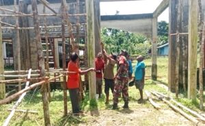 Babinsa Numfor Karya Bakti Bersama Warga Bangun Balai Kampung di Bruyadori