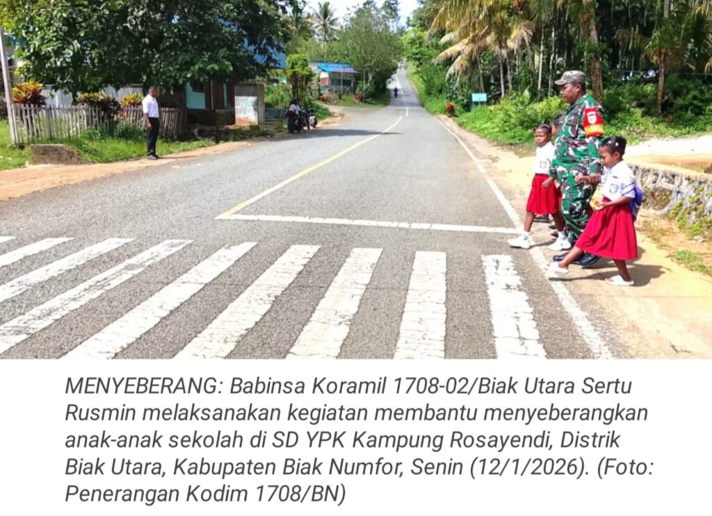 TOP-NEWS.id, BIAK UTARA – Upaya memberikan rasa aman dan nyaman bagi anak-anak sekolah di wilayah binaannya, Babinsa Koramil 1708-02/Biak Utara Sertu Rusmin melaksanakan kegiatan membantu menyeberangkan anak-anak sekolah di SD YPK Kampung Rosayendi, Distrik Biak Utara, Kabupaten Biak Numfor, Papua, Senin (12/1/2026).
