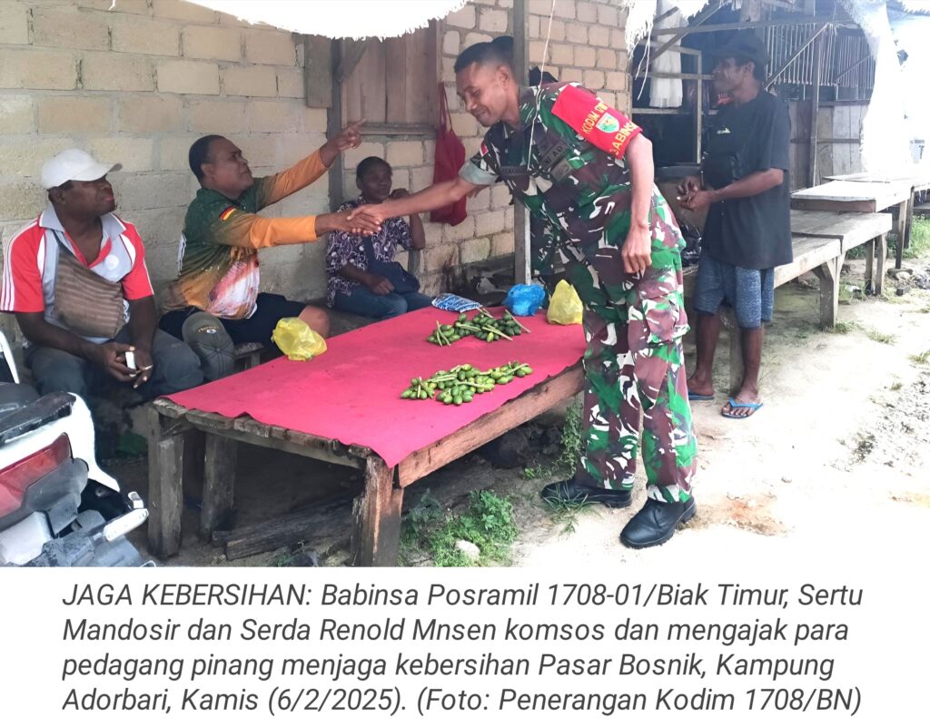 TOP-NEWS.id, BIAK TIMUR – Upaya mempererat hubungan dengan masyarakat, Babinsa Posramil 1708-01/Biak Timur Sertu Mandosir dan Serda Renold Mnsen melaksanakan kegiatan komunikasi sosial (komsos) di Pasar Bosnik, Kampung Adorbari, Distrik Biak Timur, Kabupaten Biak Numfor, Papua, Kamis (6/2/2025).