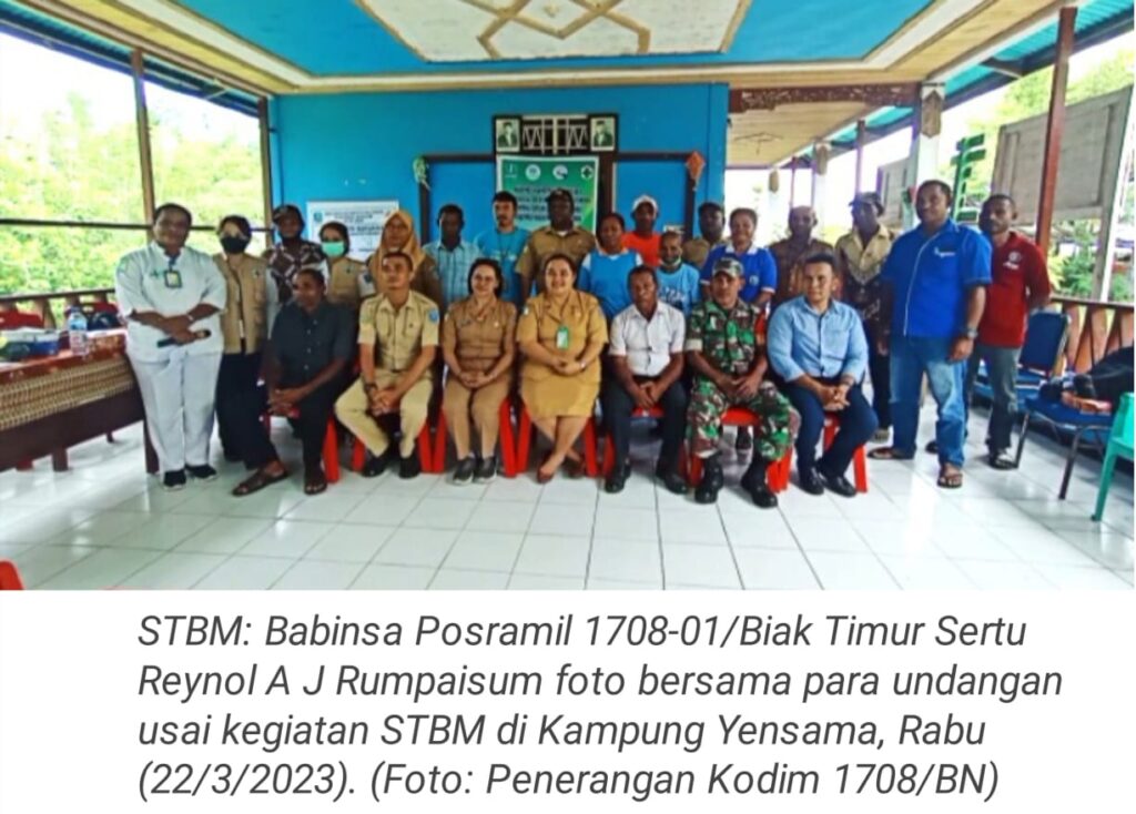 TOP-NEWS.id, ORIDEK – Sebagai bentuk kepedulian terhadap sanitasi dan kebersihan masyarakat di wilayah binaan, Bintara Pembina Desa (Babinsa) Posramil 1708-01/Biak Timur Sertu Reynold A J Rumpaisum menghadiri kegiatan Sosialisasi Sanitasi Total Berbasis Masyarakat (STBM) yang diselenggarakan UPTD Puskesmas Marauw.