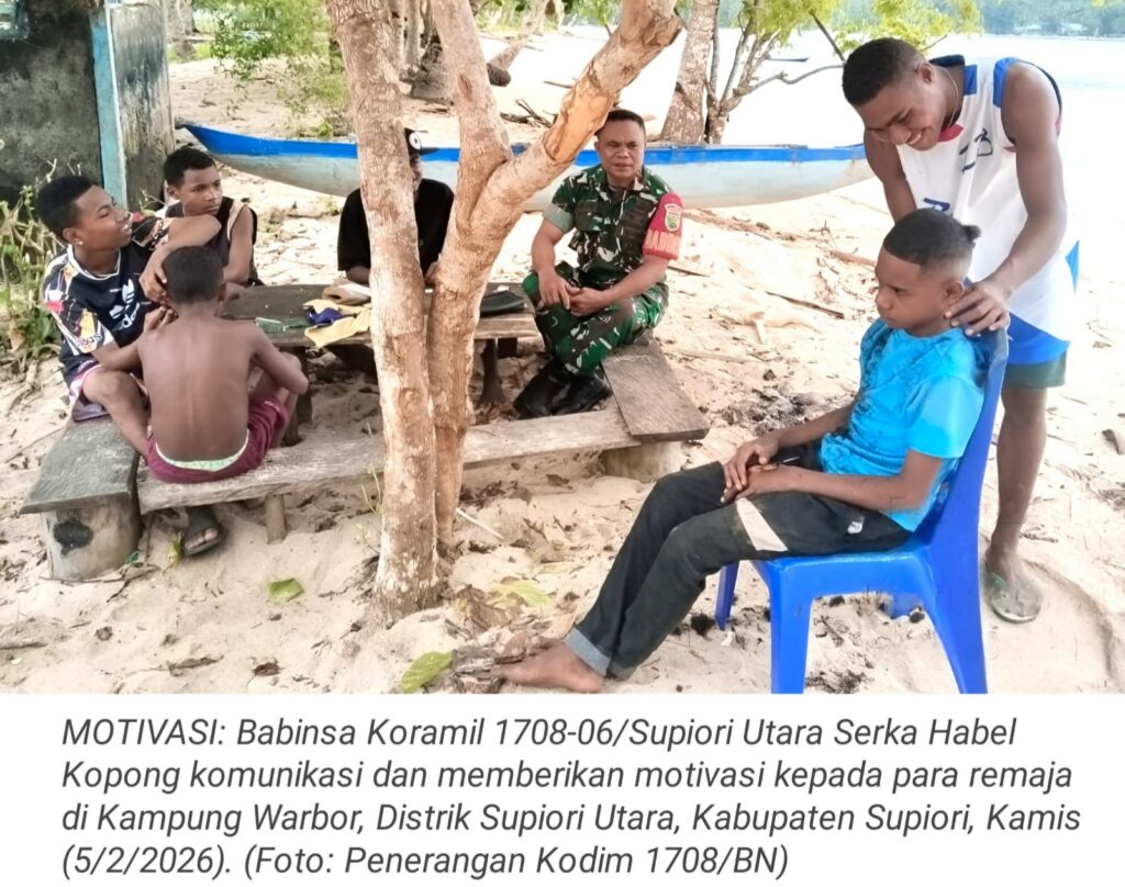 TOP-NEWS.id, SUPIORI – Babinsa Koramil 1708-06/Supiori Utara Serka Habel Kopong memberikan motivasi kepada para remaja di Kampung Warbor, Distrik Supiori Utara, Kabupaten Supiori, Papua, Kamis (5/2/2026).