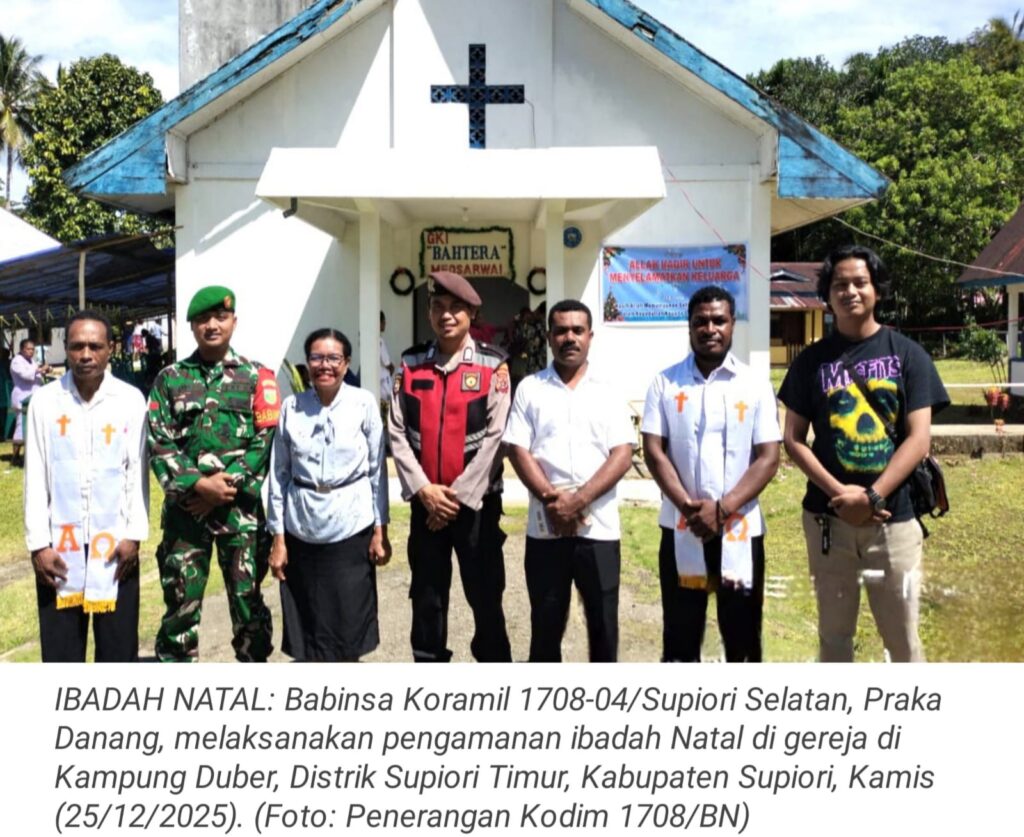 TOP-NEWS.id, SUPIORI SELATANBabinsa Koramil 1708-04/Supiori Selatan, Praka Danang melaksanakan pengamanan ibadah Natal di gereja yang berada di Kampung Duber, Distrik Supiori Timur, Kabupaten Supiori, Papua, Kamis (25/12/2025).