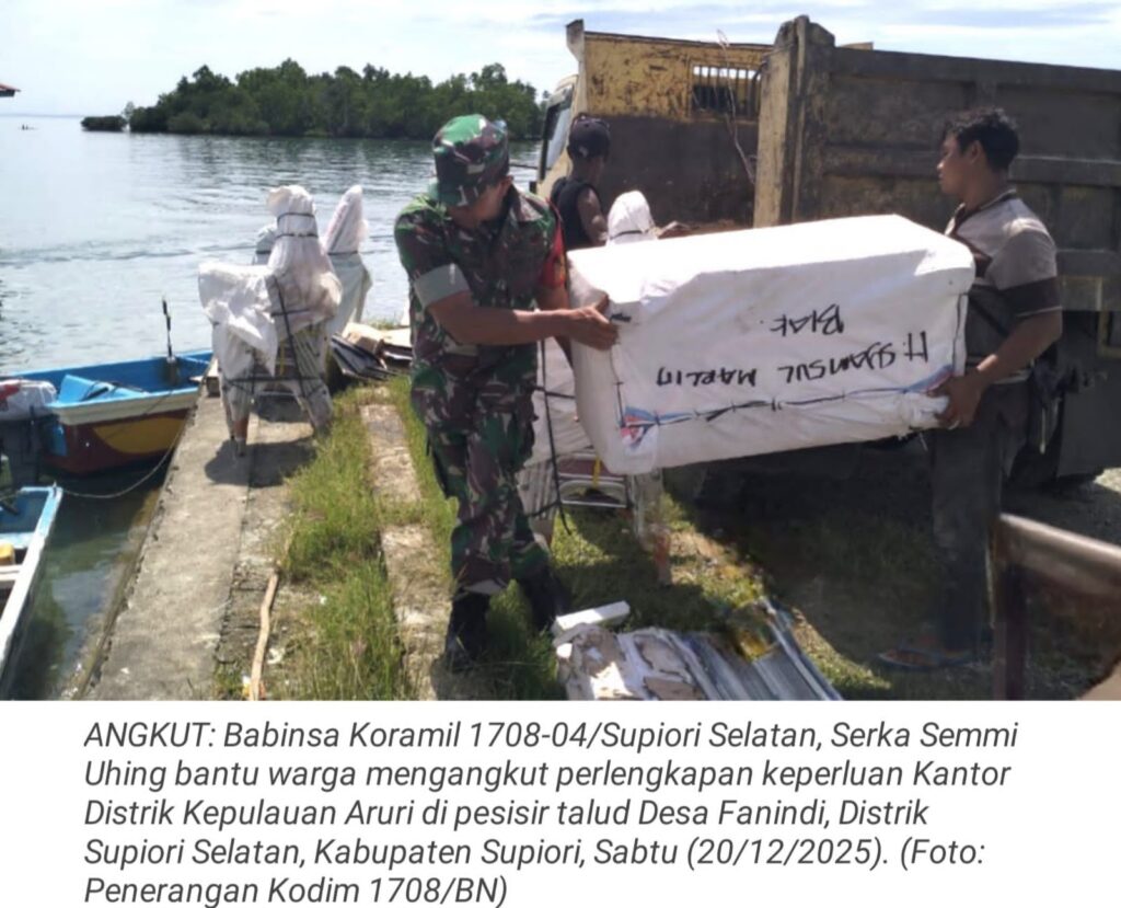 TOP-NEWS.id, SUPIORI SELATAN – Babinsa Koramil 1708-04/Supiori Selatan, Serka Semmi Uhing membantu warga mengangkut perlengkapan keperluan Kantor Distrik Kepulauan Aruri di pesisir talud Desa Fanindi, Distrik Supiori Selatan, Kabupaten Supiori, Papua, Sabtu (20/12/2025).