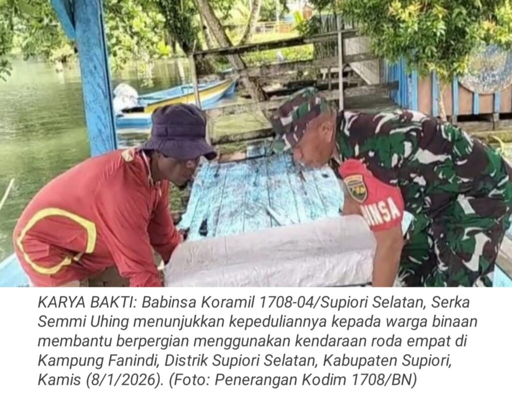 TOP-NEWS.id, SUPIORI SELATAN – Babinsa Koramil 1708-04/Supiori Selatan, Serka Semmi Uhing menunjukkan kepeduliannya kepada warga binaan membantu warga yang akan berpergian menggunakan kendaraan roda empat di Kampung Fanindi, Distrik Supiori Selatan, Kabupaten Supiori, Papua, Kamis (8/1/2026).