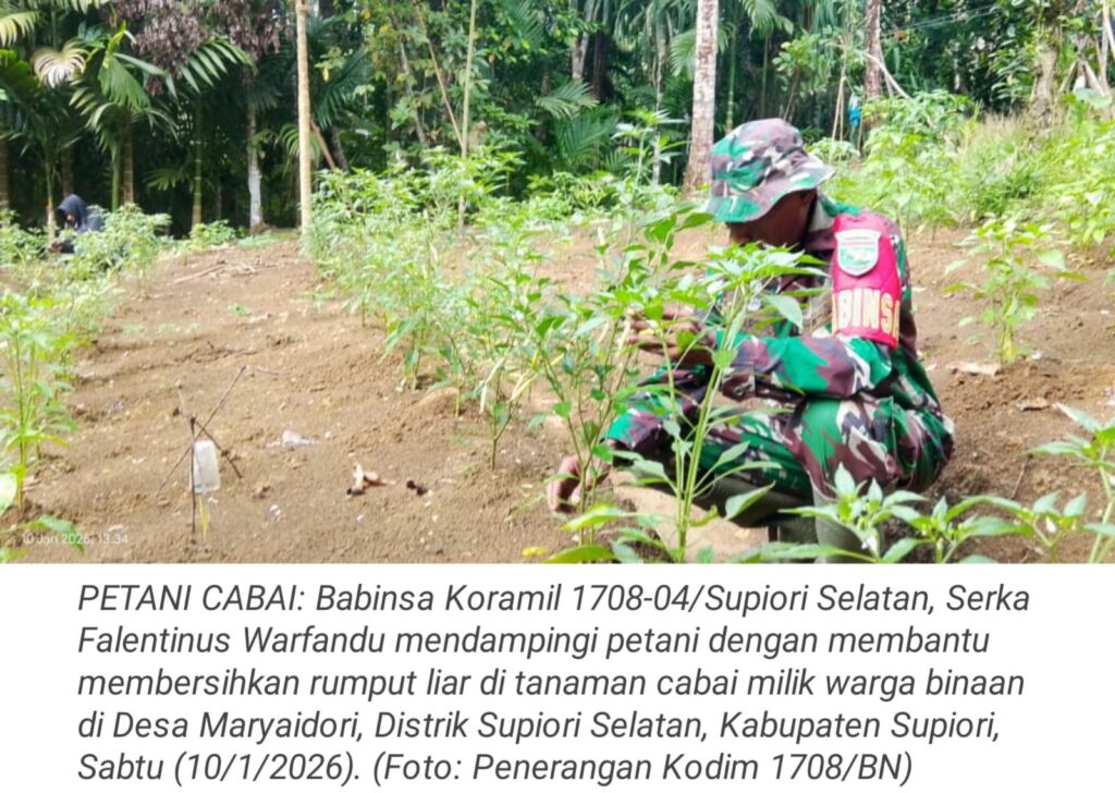 TOP-NEWS.id, SUPIORI – Babinsa Koramil 1708-04/Supiori Selatan, Serka Falentinus Warfandu lakukan pendampingan terhadap petani cabai dan membantu membersihkan rumput liar di tanaman cabai milik warga binaan Desa Maryaidori, Distrik Supiori Selatan, Kabupaten Supiori, Papua, Sabtu, (10/1/2026).
