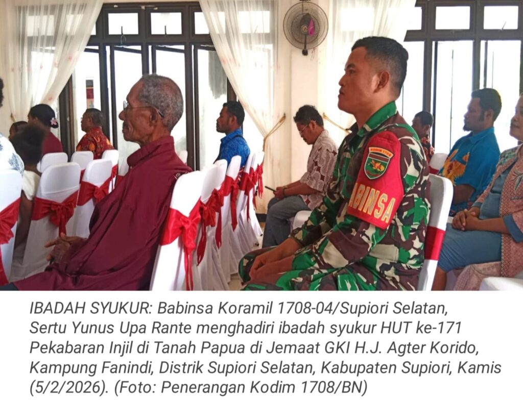 TOP-NEWS.id, SUPIORI SELATAN – Babinsa Koramil 1708-04/Supiori Selatan, Sertu Yunus Upa Rante menghadiri ibadah syukur Hari Ulang Tahun (HUT) ke-171 Pekabaran Injil di Tanah Papua, yang dilaksanakan di Jemaat GKI H.J. Agter Korido, Kampung Fanindi, Distrik Supiori Selatan, Kabupaten Supiori, Papua, Kamis (5/2/2026).