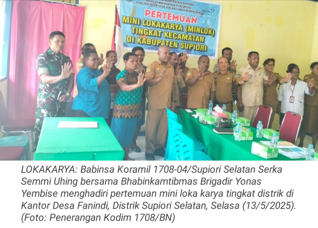 TOP-NEWS.id, SUPIORI SELATAN – Babinsa Koramil 1708-04/Supiori Selatan Serka Semmi Uhing bersama Bhabinkamtibmas Brigadir Yonas Yembise menghadiri pertemuan mini lokakarya tingkat distrik di Kantor Desa Fanindi, Distrik Supiori Selatan, Kabupaten Supiori, Papua, Selasa (13/5/2025)