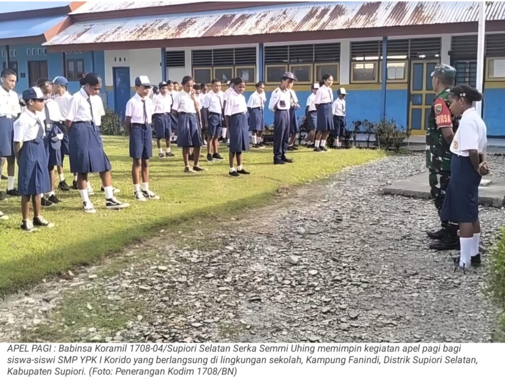 TOP-NEWS.id, SUPIORI – Babinsa Koramil 1708-04/Supiori Selatan Serka Semmi Uhing memimpin kegiatan apel pagi bagi siswa-siswi SMP YPK I Korido yang berlangsung di lingkungan sekolah, Kampung Fanindi, Distrik Supiori Selatan, Kabupaten Supiori, Selasa (20/1/2026).