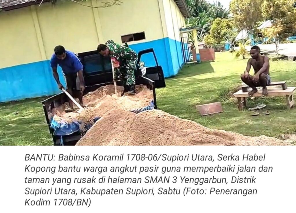 TOP-NEWS.id, SUPIORI UTARA – Wujud kepedulian terhadap masyarakat binaan terus ditunjukkan Babinsa Koramil 1708-06/Supiori Utara, Serka Habel Kopong dengan membantu warga mengangkut pasir guna memperbaiki jalan dan taman yang rusak di halaman SMA Negeri (SMAN) 3 Yenggarbun, Distrik Supiori Utara, Kabupaten Supiori, Papua, Sabtu (21/2/2026).