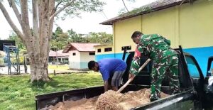 Babinsa Supiori Utara Karya Bakti Angkut Pasir Perbaiki Halaman Sekolah